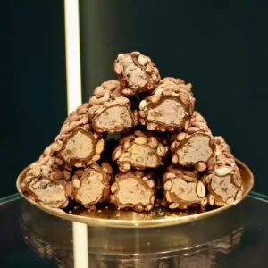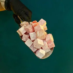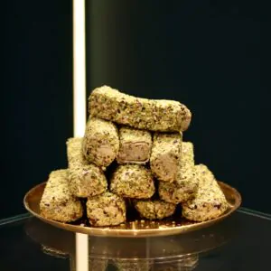 Una combinación excepcional que une la acidez de la granada, la textura crujiente de la avellana, el aroma del pistacho y el toque silvestre de la mora negra, todo envuelto en una capa suave de lokum enrollado a mano.